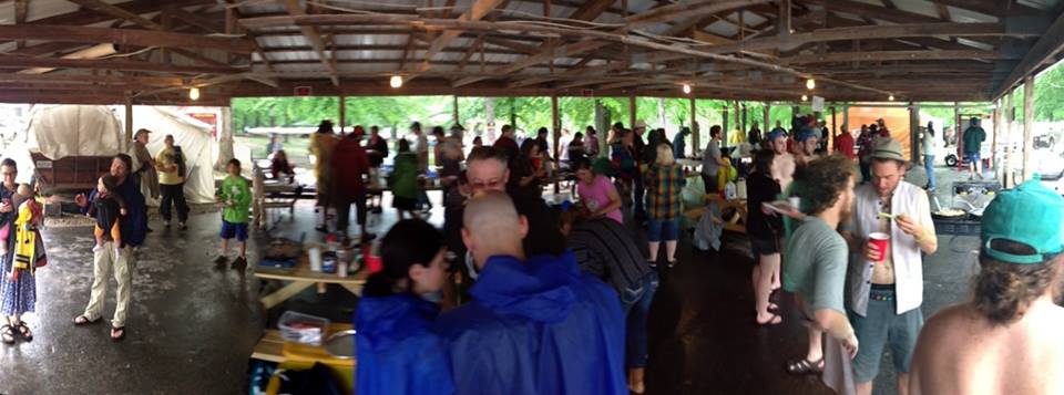 6am Friday morning, Kaboom! It’s coming down in buckets! The wind is blowing strong but the tent is holding up. No rain is coming in so I’ll sleep a bit longer, yea right. 7:30AM, OK here we go. I Jump in the car and start circling the park, around and around. Where is Bob, the festival manager? “Hey Bob, please, please let us have Chompdown at the pavilion”? Chompdown is officially moved. I tell a few folks and head back to camp to grab food and my cooking equipment and head over to the pavilion. I get there and here comes Bob from Indy with a propane stove and all of the makings for homemade sausage gravy. Oh yeah, this is on, as the cooks start to fill the pavilion, the stoves are set up, the griddles are greasy and the pancakes and French toast start flipping. Eggs are cracking, scrambled anyone? Bloody Mary bars, yes we have multiple. Consumed by all that came including cooks, spectators, musicians and volunteers was about 30 pounds of bacon, 10lbs of Goeta, One big old pot of sausage gravy, 15 pounds of homemade hash browns, 35 dozen eggs, and a watermelon. We even had a food vendor join in the fun with French toast as well as pancakes flipped and served by Katie, John Hartford’s daughter. Everyone is stuffed; there was no more food left. We pulled off the first true community event within our John Harford Memorial Festival family. Look for the Chompdown to be bigger and better in 2014 at JHMF IV!!