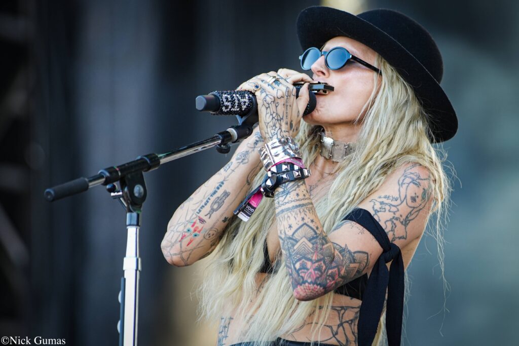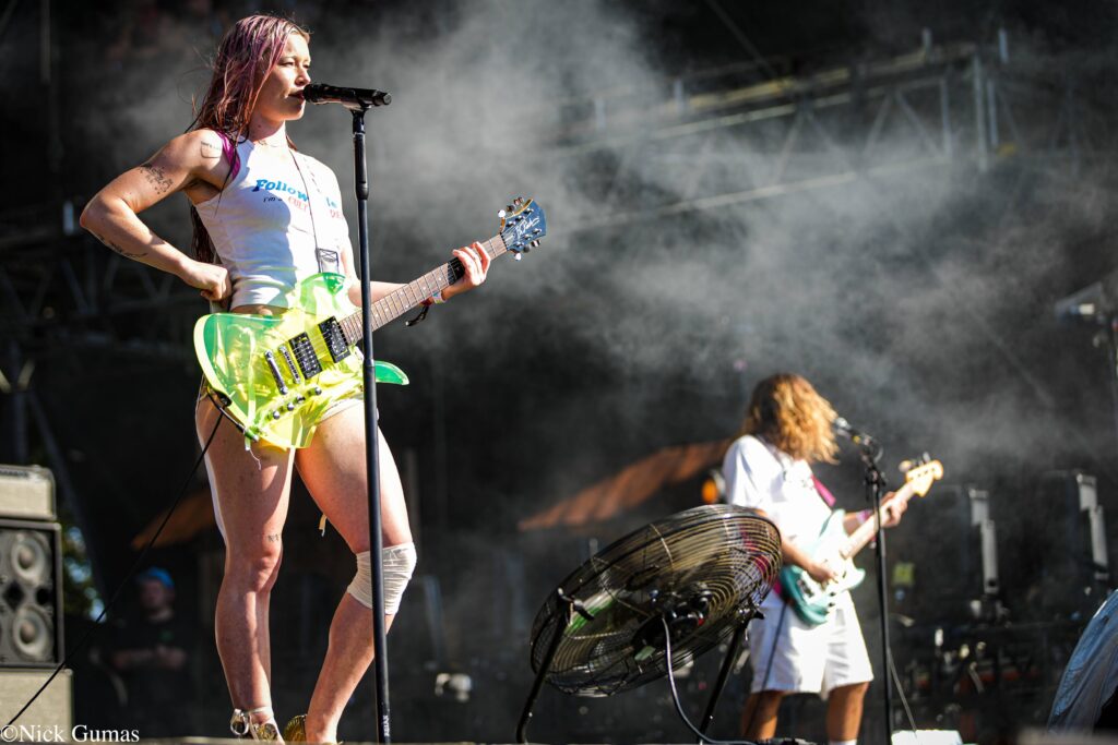Electrifying the house mid day, Isle of White indie rock outfit, Wet Leg, galvanized the audience through under the hot Texas sun. Starting off with a declaration of authority, vocalist Rhian Teasdale appeared onstage wearing a shirt reading “Follow me! I’m a cult leader” and flexed her muscles before the group opened with their recent single “catch these fists.” Keeping the momentum rolling, Teasdale picked up a guitar and led the group into an uptempo rendition of their 2022 hit “Wet Dream.” Never letting their enthusiasm wane, they powered through a long series of thrashy tracks including “Too Late Now,” “CPR,” and “mangetout.”
