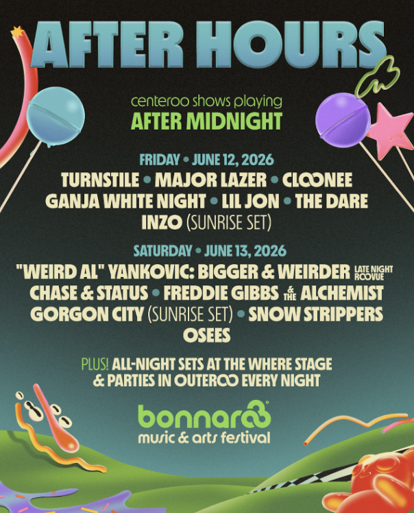 New additions to Bonnaroo’s already stacked After Hours lineup include Ganja White Night and an extra Sunrise Set from INZO on Friday, June 12. Centeroo shows slated for after midnight also include Turnstile, Major Lazer, Cloonee, Lil Jon, and The Dare (Friday, June 12), and “Weird Al” Yankovic’s Bigger & Weirder Late Night Roovue, Chase & Status, Freddie Gibbs & The Alchemist, Gorgon City (Sunrise Set), Snow Strippers, and Osees.