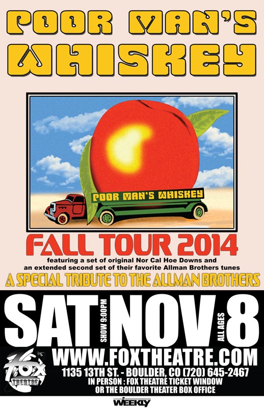 Poor Man’s Whiskey brings “A Special Tribute to The Allman Brothers Band” to the Fox Theatre to Boulder, Colorado. The sound of California meeting southern rock, in the form of renditions of PMW’s favorite Allman Brother’s songs, is a show not to be missed. With the wailing organ, dueling guitars, thumping upright bass, tight drumming, and of course some Poor Man’s Whiskey style banjo playing, The Allman Brothers material and PMW have never been heard like this before. In addition every show starts off with a set of PMW’s beloved originals. Opening for PMW will be High Peaks Band.