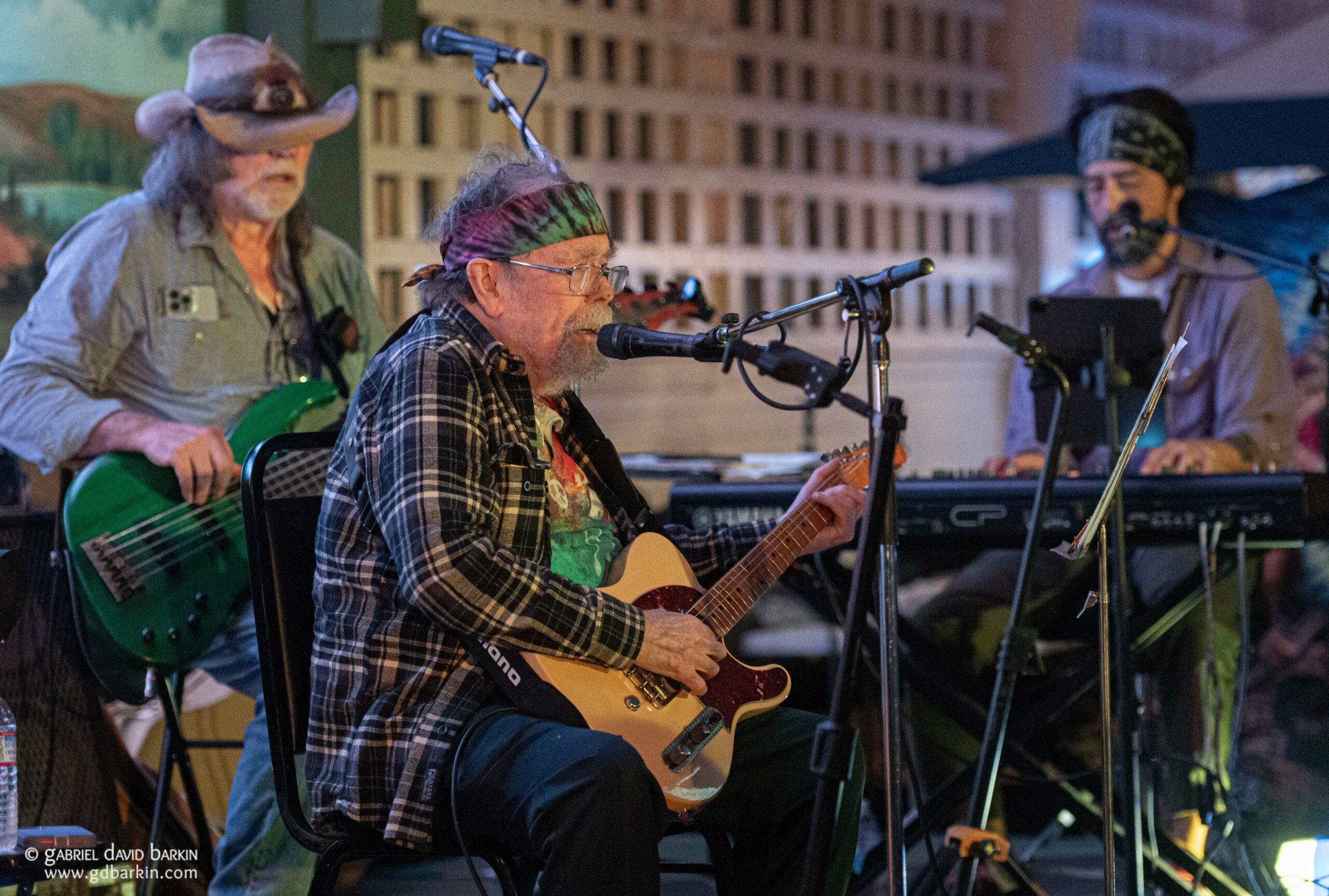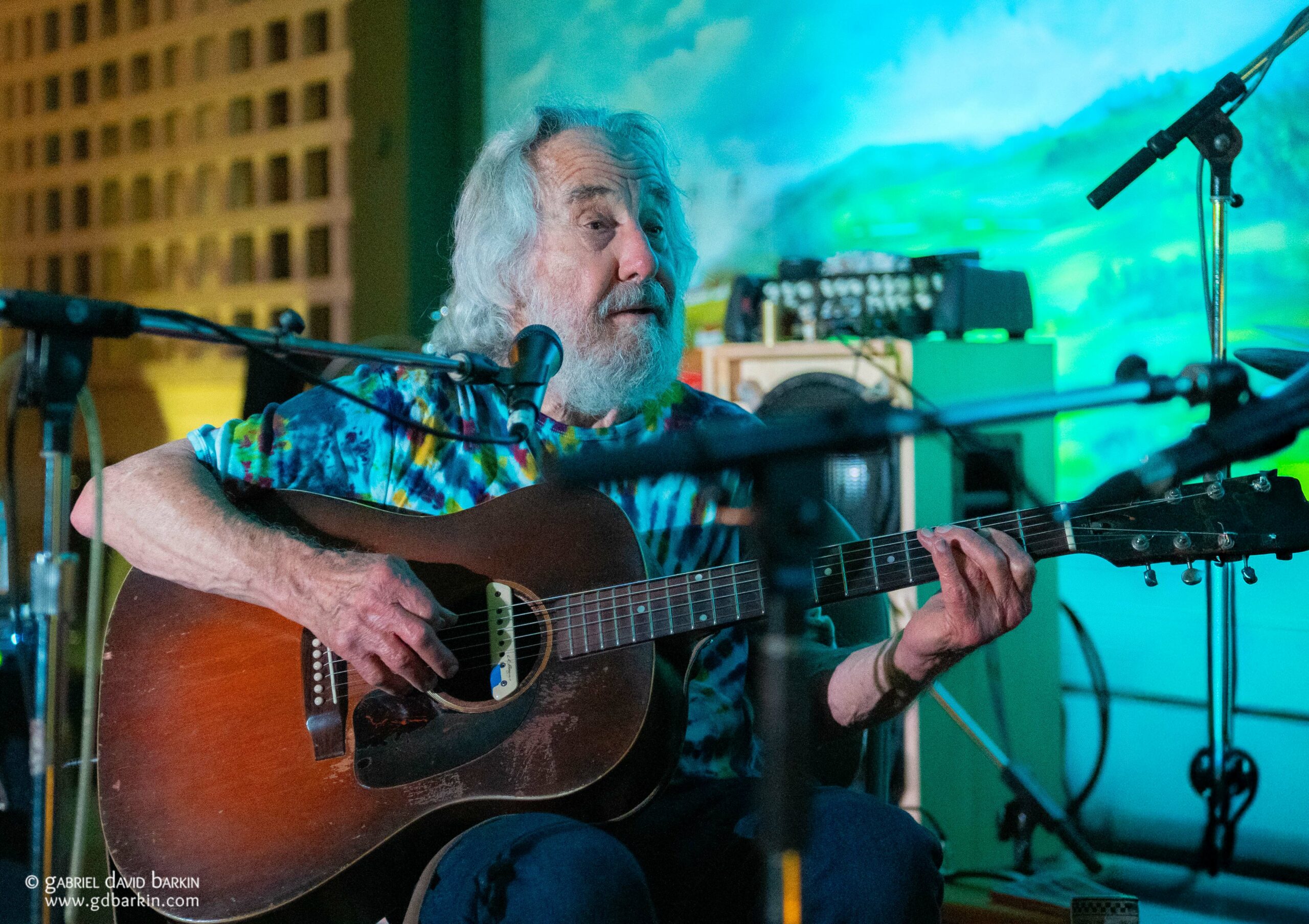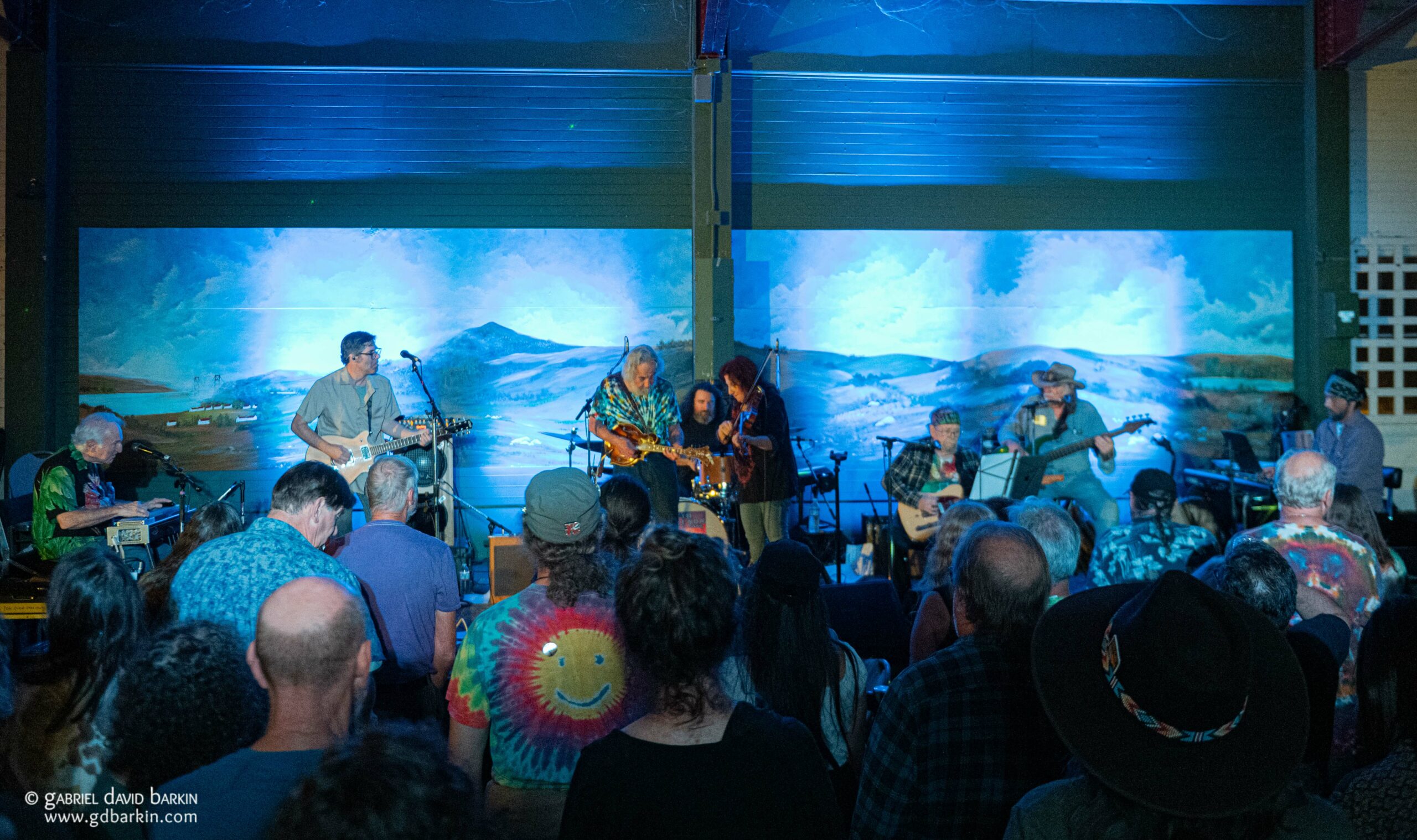 The Fairfax Pavilion is a community center on a small hill above the downtown area. It’s essentially a big, open gym with a small stage set up on one side of a basketball court. A pastoral painting of pastures covering the undeveloped Marin Headlands provides a backdrop for the stage. During the Hootenanny, a live Grateful Dead stadium performance from the 1980s was projected silently on one of the walls, and it seemed like Jerry, Brent and Bobby were singing along with Nelson. There were tie-dyes hanging all around, and a few local vendors got to sell their tie-dye merch Inside.