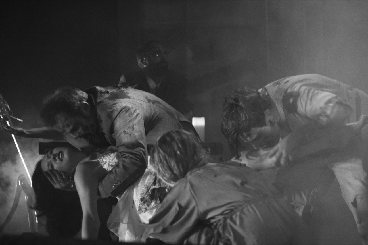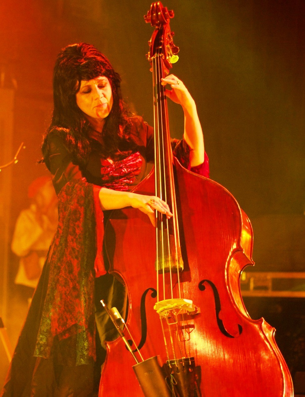 Devotchka was preceded by a short vignette in which a girl dressed in white can wandering out onto the stage, only to be attacked by zombies and dragged away in a cloud of smoke. The band came out in the middle of this ordeal and took there spots, the theme having split them in half – Tom (violin, piano, and accordion) and Shawn (drums, percussion, and trumpet) played the zombies, while Nick (vocals, guitar, and spookiest of all, the Theremin) and Jeanie (sousaphone and upright bass) took on the vampire role.