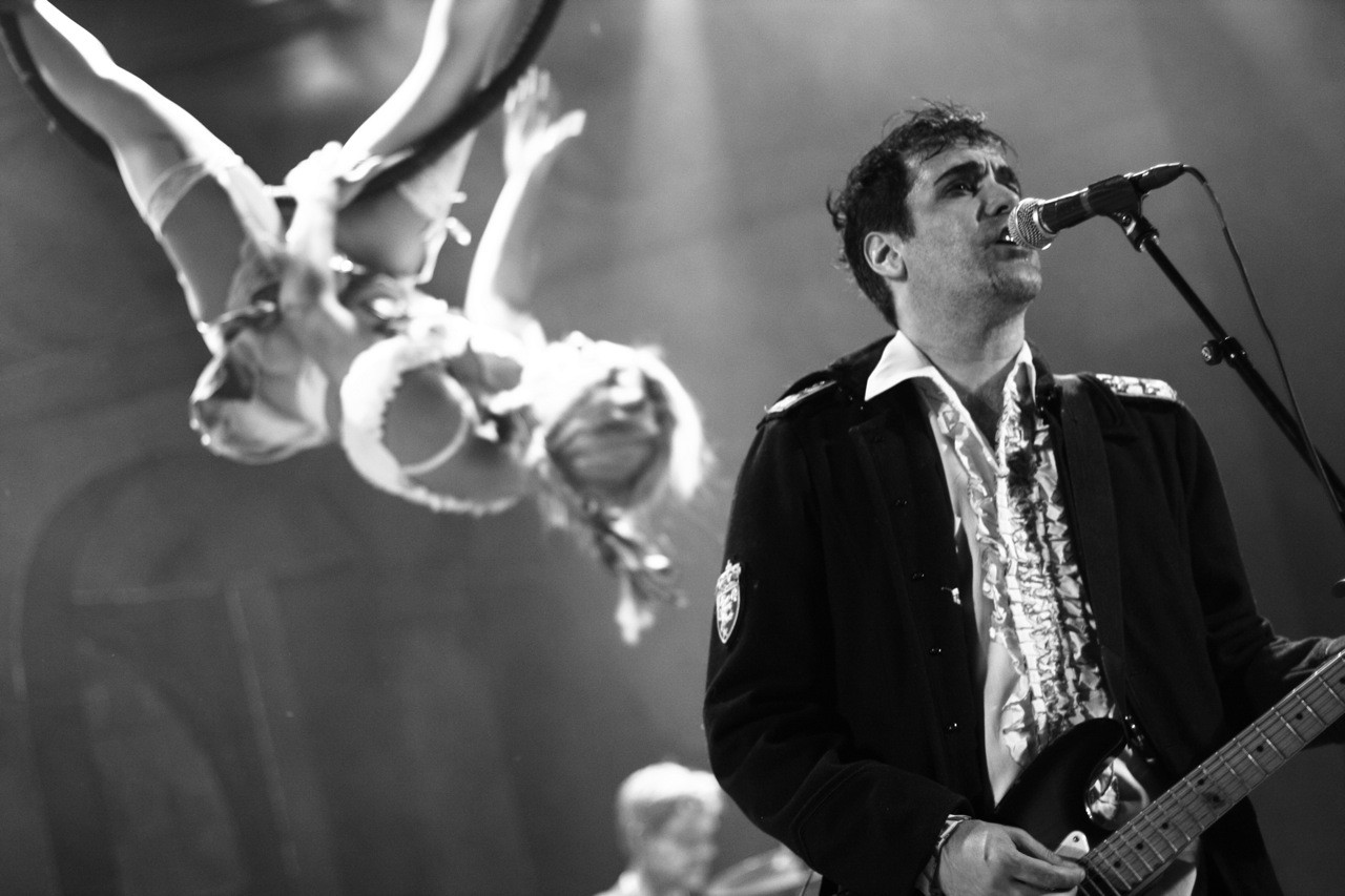 One of the highlights of the Devotchka Halloween show is the aerialists and gymnasts that they feature – suspended from the rafters, spinning and twirling in a graceful frenzy as the band rocks out below. This year, a whole crew of gymnasts accompanied the band, including a vampire who scaled a set of flowing red curtains like it was the easiest thing in the world, and a pair of women who did a paired act hanging from a single, giant ring. Needless to say, during these moments almost no one was looking at the band.