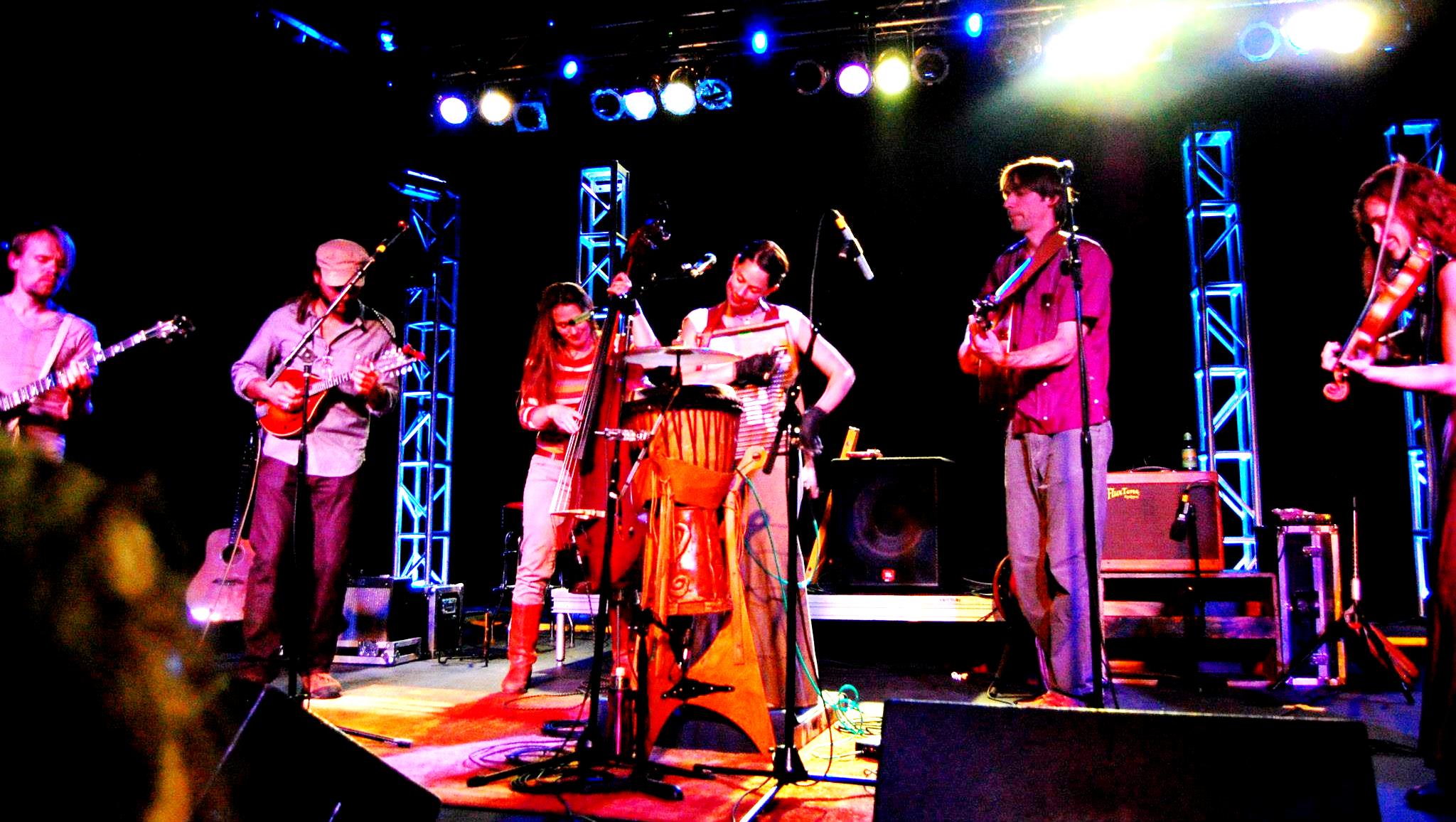 The show began with a great set from Meandering Orange (I think an Oklahoma band, but I’m having trouble finding any information on them besides the festivals they’ve played). They plucked and played like the best of them, and I was pretty impressed with their song selection. One of the crowd’s favorites being a tune (according to a member of the band – a song about Facebook) with lyrics that went something like: Who really cares if I get stoned/lock all the doors, stay home all alone./It’s my God-given right to do as I please./I don’t worry ’bout you, don’t you worry ’bout me. From the start of the night’s music to the end, the stage was filled with great musicians and special appearances. Bridget Law accompanied the band on a few songs, and improvised (I assume) beautifully. Annie Paine (Bonnie’s sister) showed up frequently onstage during both band’s sets. Meandering Orange‘s set ended and the band received an enthusiastic round of applause, hoots and hollers.