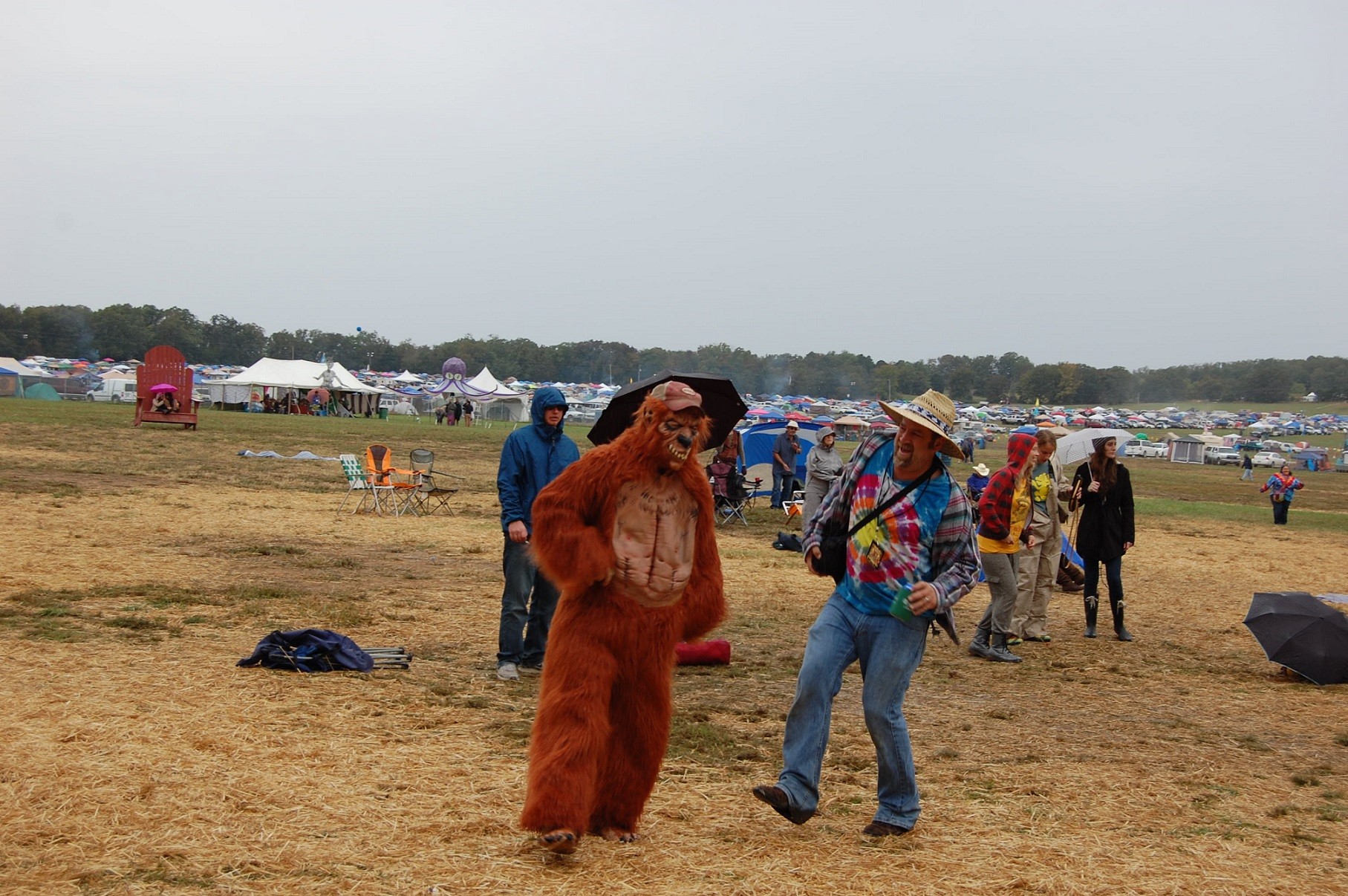 The first show we actually made it down to was Dirtfoot at Main Stage. The rain had just really began to fall, forming fresh mud under damp straw and providing the perfect stompin’ conditions for a crowd that was ready to party. Dirtfoot is one of those bands who is perfectly in their element when there’s a little mud and lot of rowdiness. I have never seen a xylophone rocked so hard before in my life. The crowd was clearly fueled by the band’s gypsy-punk-country-grumble-boogie energy: everyone who was up closer to the stage was dancing, some with ponchos and umbrellas, some who didn’t seem to care at all about the rain. Suddenly, two huge sasquatches began dancing their way into the crowd and one of the guys from Coyote Union started dancing with one of them. He was so happy to have his picture taken at Dirtfoot with Bigfoot! I hope I can somehow stay up late enough to see their set at The Roost stage at 2 AM on Sunday morning!