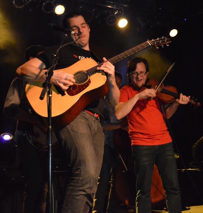 Each member has a very different personality. There’s Travis Book. He strums his bass always with a beaming smile and seems to move around the most onstage despite his large instrument. Chris Pandolfi plays the banjo. And he plays it usually with a look of serenity on his face until he’s – at that point his brow furrows in concentration and he grins passionately. Jeremy Garrett on fiddle is always concentrating, lifting from one musician to the other – he moves around almost as much as Book. Garrett makes it look easy to play his parts, but I assure you they are not, especially in front of his sister (who was in the audience for this show). At one point during the set he even somehow made his fiddle trumpet. There’s Andy Hall on dobro with a fun, get-down style. His slides are enthusiastic and picking is intricate. I’m always fascinated by the dobro. Andy Falco plays the guitar with passion and fervor; he takes on long, difficult solos and throws himself into each note and melody.