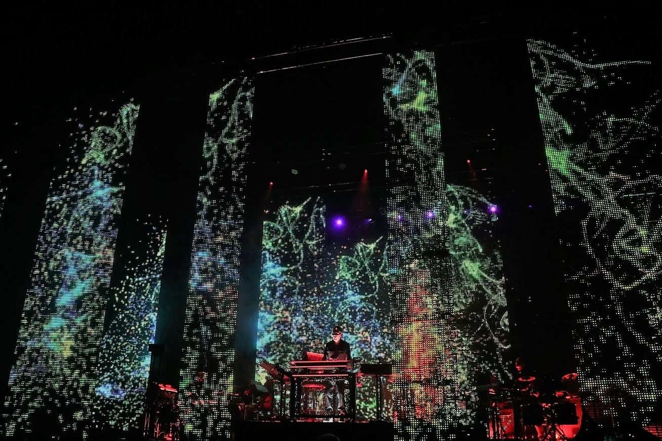 At the show May 27, Jarre showcased new music from his two-part LP Electronica and most recent release Oxygene, alongside classic material from breakthrough albums such as Oxygene and Equinoxe. One of the many collaborators on the Electronica album, local Los Angeles transplant, Gary Numan, could be seen beaming in the audience. The most political moment of the night came during the sixth song of the set, Exit, Jarre dedicated the song to his friend Edward Snowden. Large media clips of Snowden were played during the song espousing the public’s right to privacy from government oversight. On the eighth song, Conquistador, Jarre broke into an electric guitar solo showcasing his rock talents. Jarre even played an iPad on the song, Immortals, late in the set.