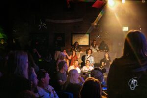 “Nice Girl (Walks Loud)” and “One of Us” were like a mid-evening outfit change. Suddenly, we weren’t whispering anymore. Things got messy in the best way. I ran into the street team, all eager to scene and be seen. We got to gabbing the way you do when the room holds you in like a hug. The whole experience widened, off the stage, in between the tables, into the corners, and onto the bars.