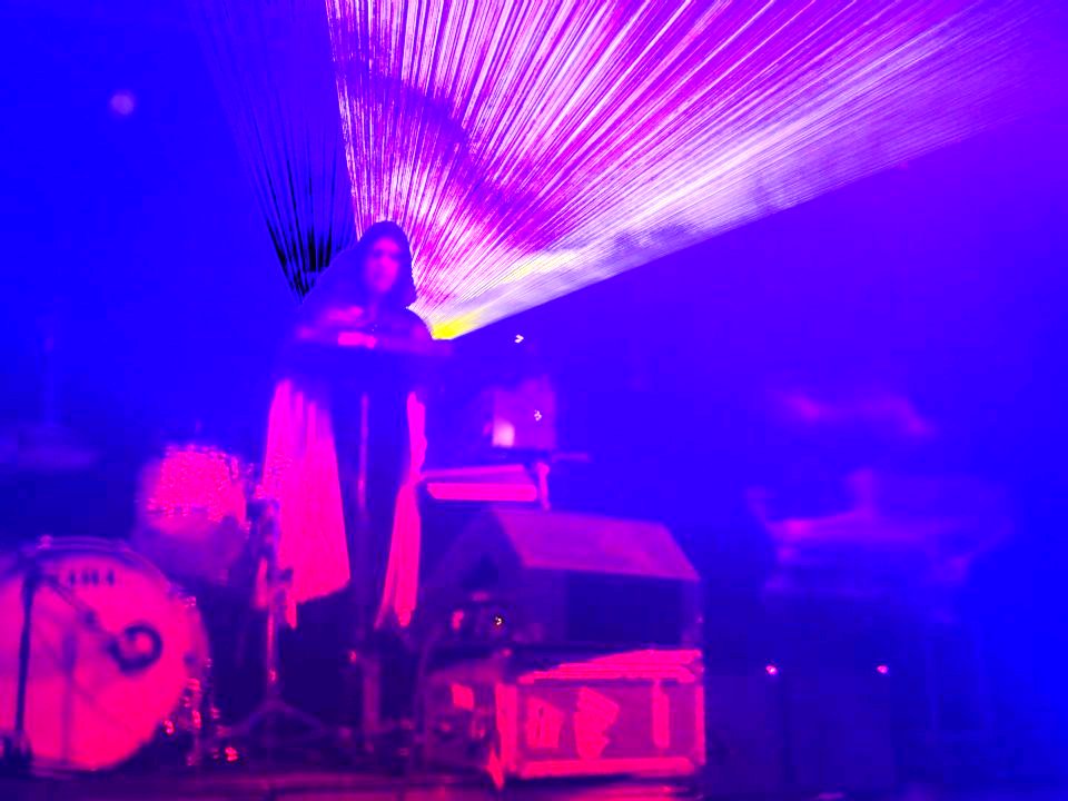 Thomas Ross Turner is a caped DJ in the middle of the stage with lasers blasting around him, along with a drum set which he plays as well. Front man Aaron Behrens runs around the stage like a maniac, sometimes playing guitar but always singing and screaming lyrics. He hit high notes like I’ve never heard, and had an animated feel that is comparable to David Byrne of the Talking Heads.