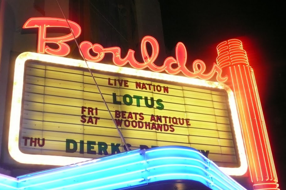 Lotus’ first show at the venerable Boulder Theater proved to deliver only the good elements of improvised music.  With historical roots that reach back to 1906, the Boulder Theater is an ideal place to enjoy a concert.  Its art deco façade and warm and inviting interior with over-sized murals seem to nurture the creativity of the artists it hosts.  Lotus took to the welcoming vibe from the onset and performed a nearly three hour flurry of improvisational music at its finest.  The palette from which Lotus creates its music is rich and diverse.  From adagio tempos with delicate compositions to presto tempos with intricate textures, there is something for everyone to enjoy.  And from the looks of it, the crowd enjoyed everything, dancing non-stop and with exuberance for the show’s entirety.  It was the kind of show that makes you remember why you love live music.  If you have the opportunity to see Lotus live, give it a shot.  You may find that new sound you’ve been looking for.