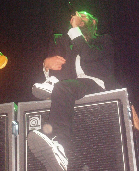 Anxiousness and excitement followed during the long wait through the set change as the theatre packed to its capacity. Shortly after ten o’clock, Matisyahu at last took the stage for an unexpectedly long jam-packed set of special guests and musical improvisation. Aside from Matisyahu himself, dressed in an open black blazer with white Nike’s, a yarmulke, and prayer tassels, the remaining three members of his band looked like a group of average guys, just walked off the street in their everyday attire. Regardless of their dress, the show was about the music, and the instant they hit the stage, the crowd met their performance with lively dancing and singing as the temperature rose. During the second half of the first hour of his set, Matisyahu surprised the audience, bringing out guests Mackenzie Roberts and Jonny 5 from local rising band, Flobots. For almost the full length of the song played together, Roberts accompanied on viola, while for only a portion of it did Jonny 5 join in with improvised vocals. An unexpected treat, the crowd welcomed the Colorado musicians, keeping up the energy and enthusiasm. This atmosphere reached pinnacle heights when, at the end of the first hour of his set, during the song “Jerusalem” Matisyahu started pulling kids in front of the stage up onto the stage with him. After the first three were up, Matisyahu needn’t say or do more – kids just started storming the stage on their own. One after another, the stage filled with a good 20-30 dancing bodies surrounding Matisyahu, himself downstage center singing and dancing along.