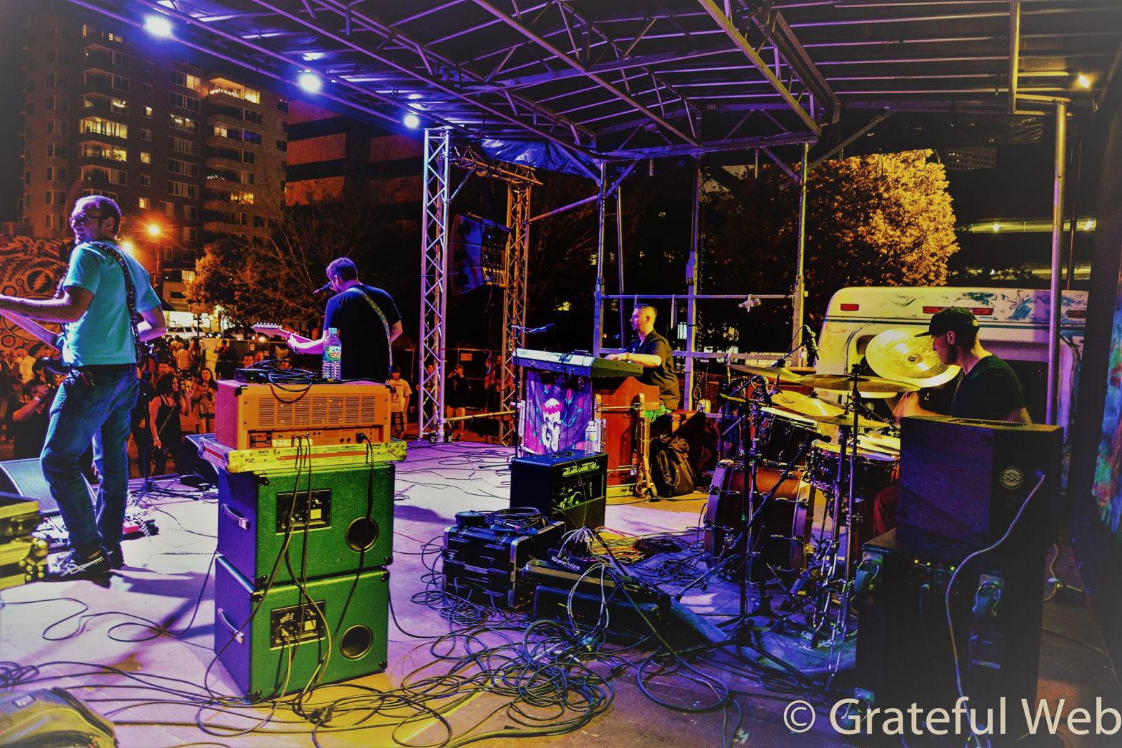 When I pulled up in the parking lot behind the venue for easiest convenient parking that I have had in ages in any major city, I was immediately inundated with the sound of a beautiful “Bird Song.” And as I got out of my car, I was instantly hit with tie dyed colors on busses, people painting, and a giant outdoor stage. I felt at home instantly. As I walked around to the front entrance at the corner, they went into “The Race is On” written by Don Rollins using horse racing as a metaphor for his romantic relationships. It was during this song that I noticed that Dave Watts was playing drums with them. Bassist Edwin Hurwitz and he sounded very tight and connected, while Josh Rosen belted lead guitar and vocals so well.