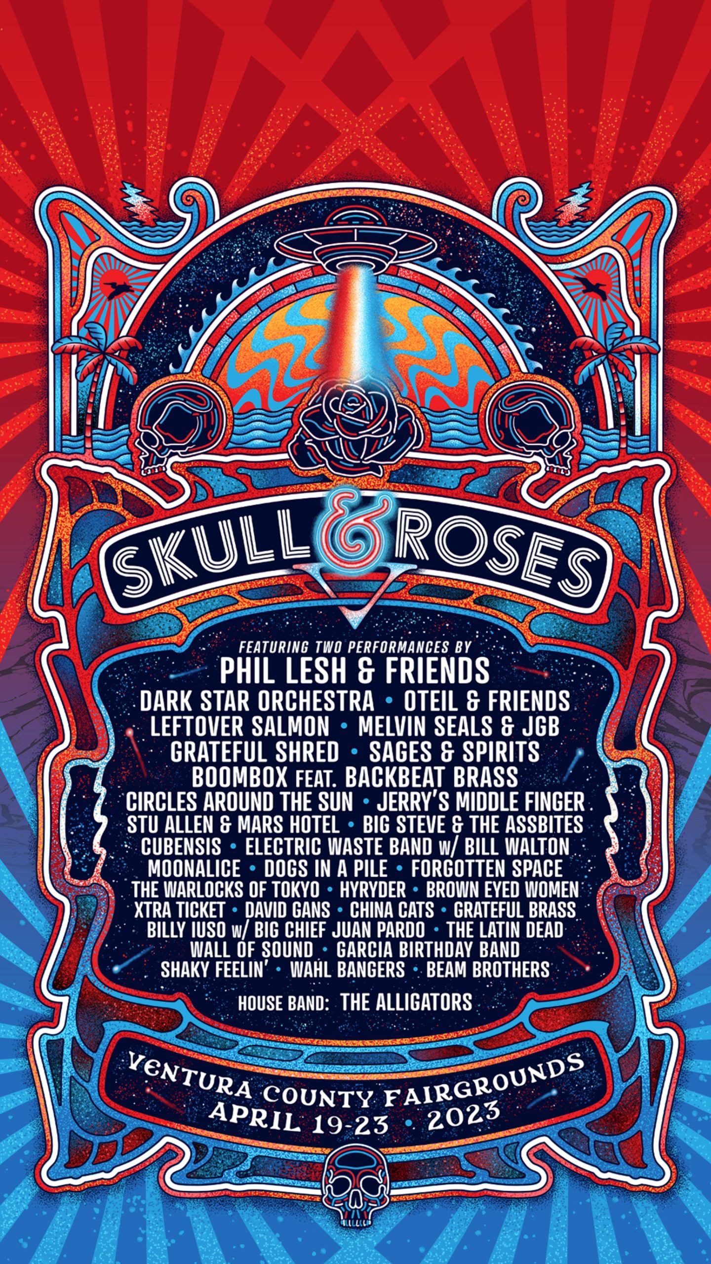 Next year’s SKULL & ROSES at Ventura County Fairgrounds, April 19-23, 2023, will be the fifth incarnation of the gathering, which is thriving just like the rest of the Grateful Dead culture it celebrates. This little party by the sea has grown enormously both in numbers and sophistication, to the point of having an original… Continue reading SKULL & ROSES V SKULL & ROSES V “Preaching On The Burning Shore”