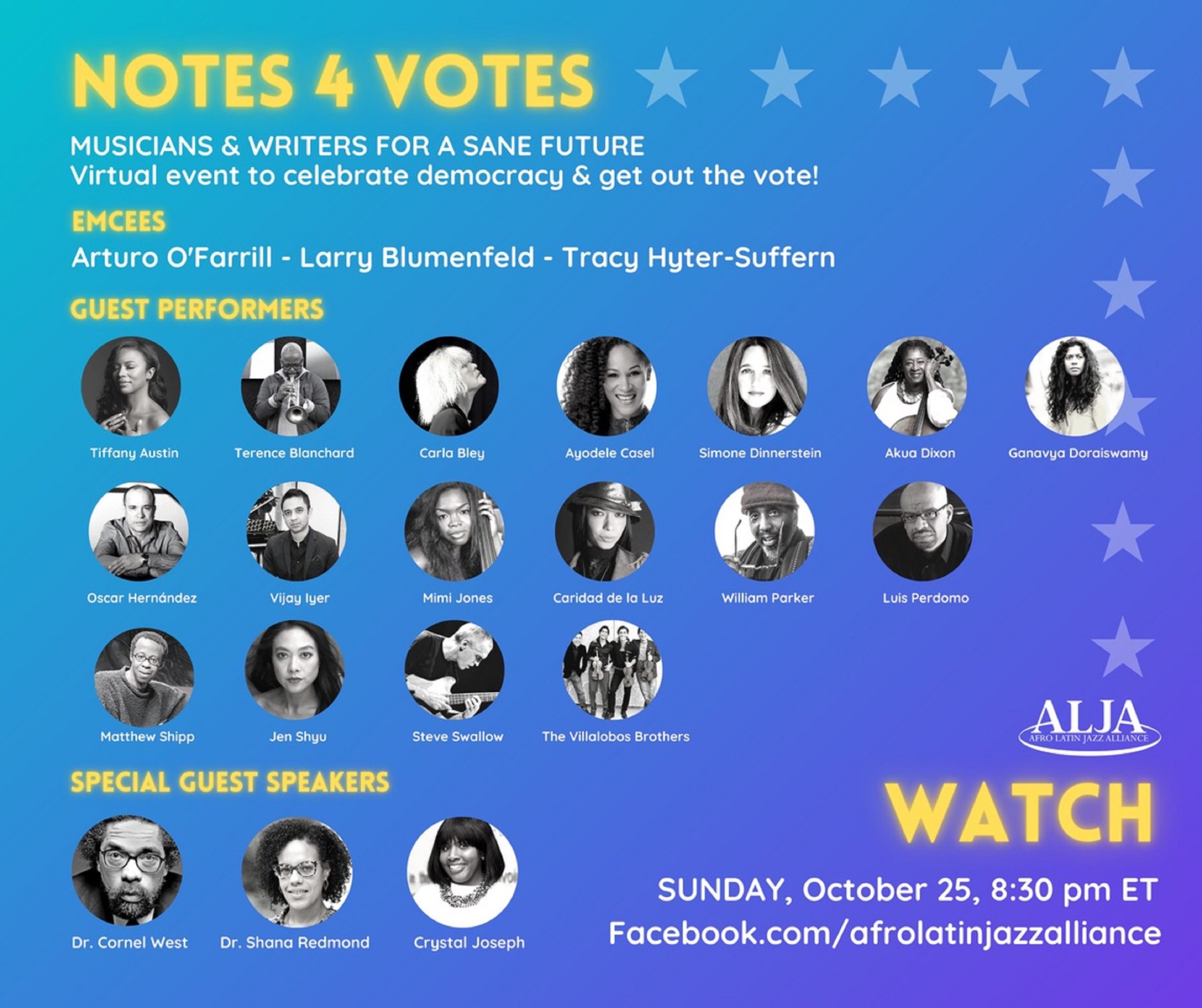Nonprofit the Afro Latin Jazz Alliance (ALJA) teams up with today’s foremost jazz, classical, and global artists alongside preeminent speakers for a “get out the vote” initiative, Notes 4 Votes, to be broadcasted on ALJA’s Facebook page facebook.com/afrolatinjazzalliance on Sunday, October 25, 2020 at 8:30pm EST. The one-time gathering captures the spirit of the creative… Continue reading "NOTES 4 VOTES" Featuring Terence Blanchard, Vijay Iyer, Carla Bley, Dr. Cornel West, Arturo O'Farrill, and Many Others