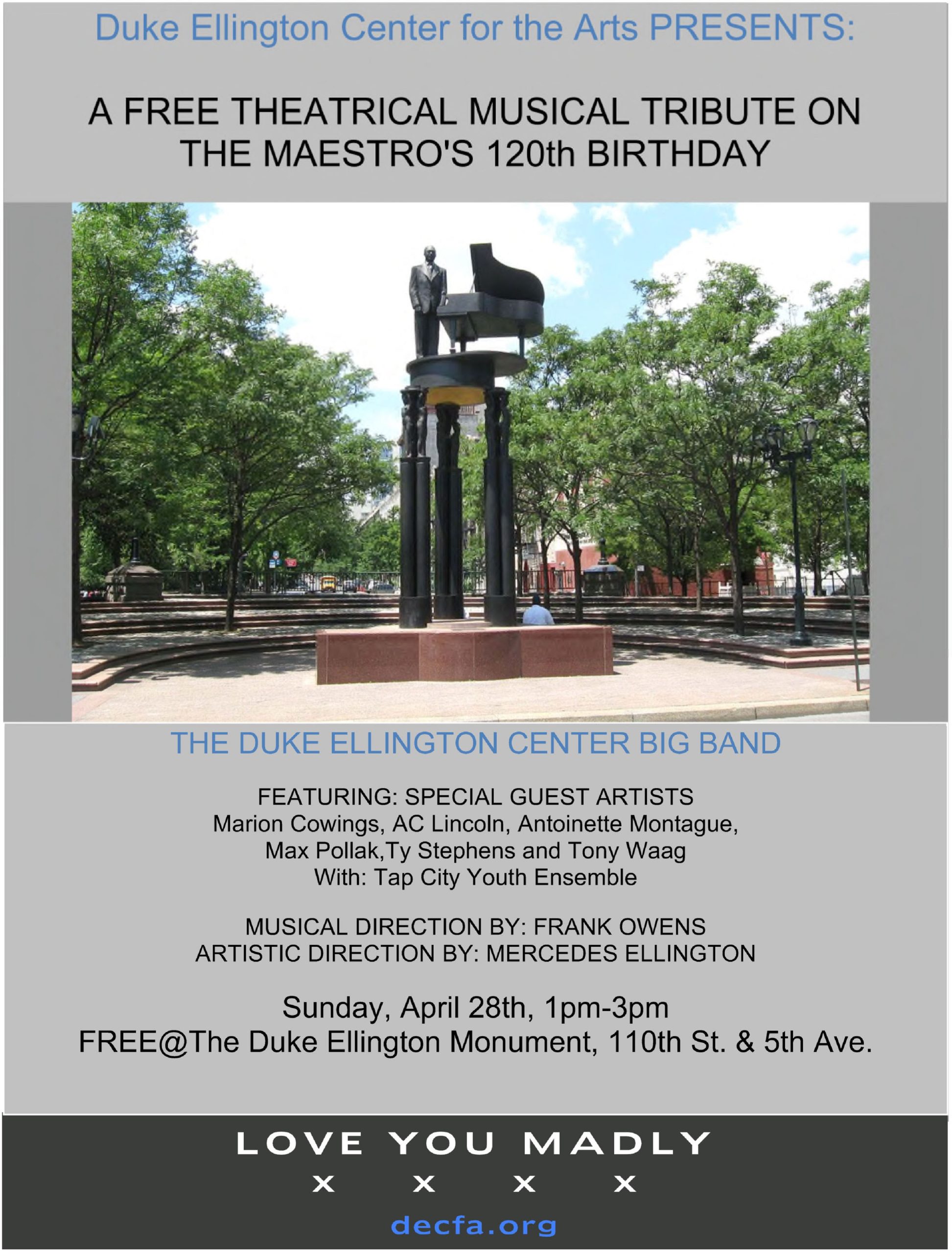 The Program will feature the Duke Ellington Center Big Band led by Frank Owens, vocal stylists Antoinette Montague and Marion Cowings, performers, Tony Waag, Sharon K. Janda, Mark Mindek, Max McGuire, Love Angel, Princess Rivera, Ty Stephens, AC Lincoln, Max Pollak, Tap City Youth Ensemble & MORE! The Duke Ellington Center for the Arts (DECFA) will… Continue reading A FREE MUSICAL CELEBRATION In Honor of the 120th BIRTHDAY OF DUKE ELLINGTON