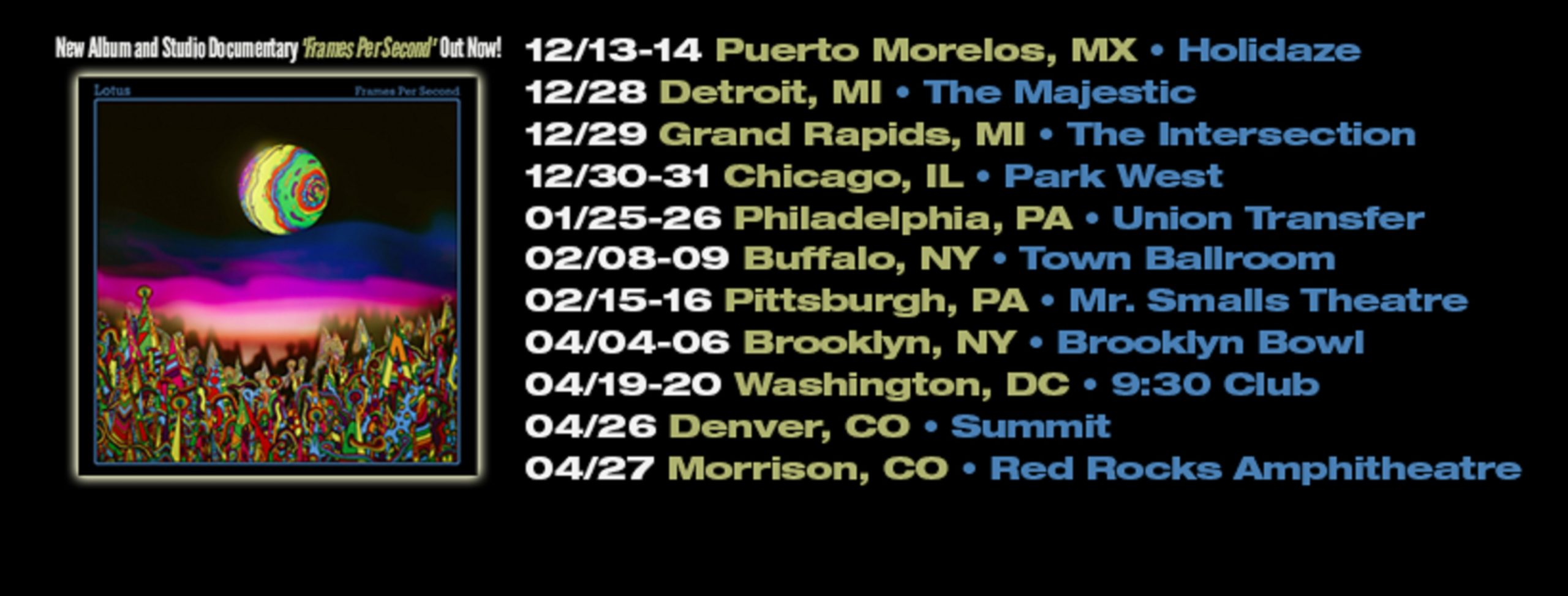 Instrumental jamband Lotus surprised fans today with the release of their new album, Frames Per Second. Tracked live at Rittenhouse Soundworks in Philadelphia with cameras rolling, the all-instrumental 19-song studio album and accompanying documentary aims to showcase Lotus in a pure, raw form performing live in the studio. Instrumental jazz-funk, Norwegian space-disco and psychedelic rock… Continue reading Lotus' new album 'Frames Per Second' Out Now