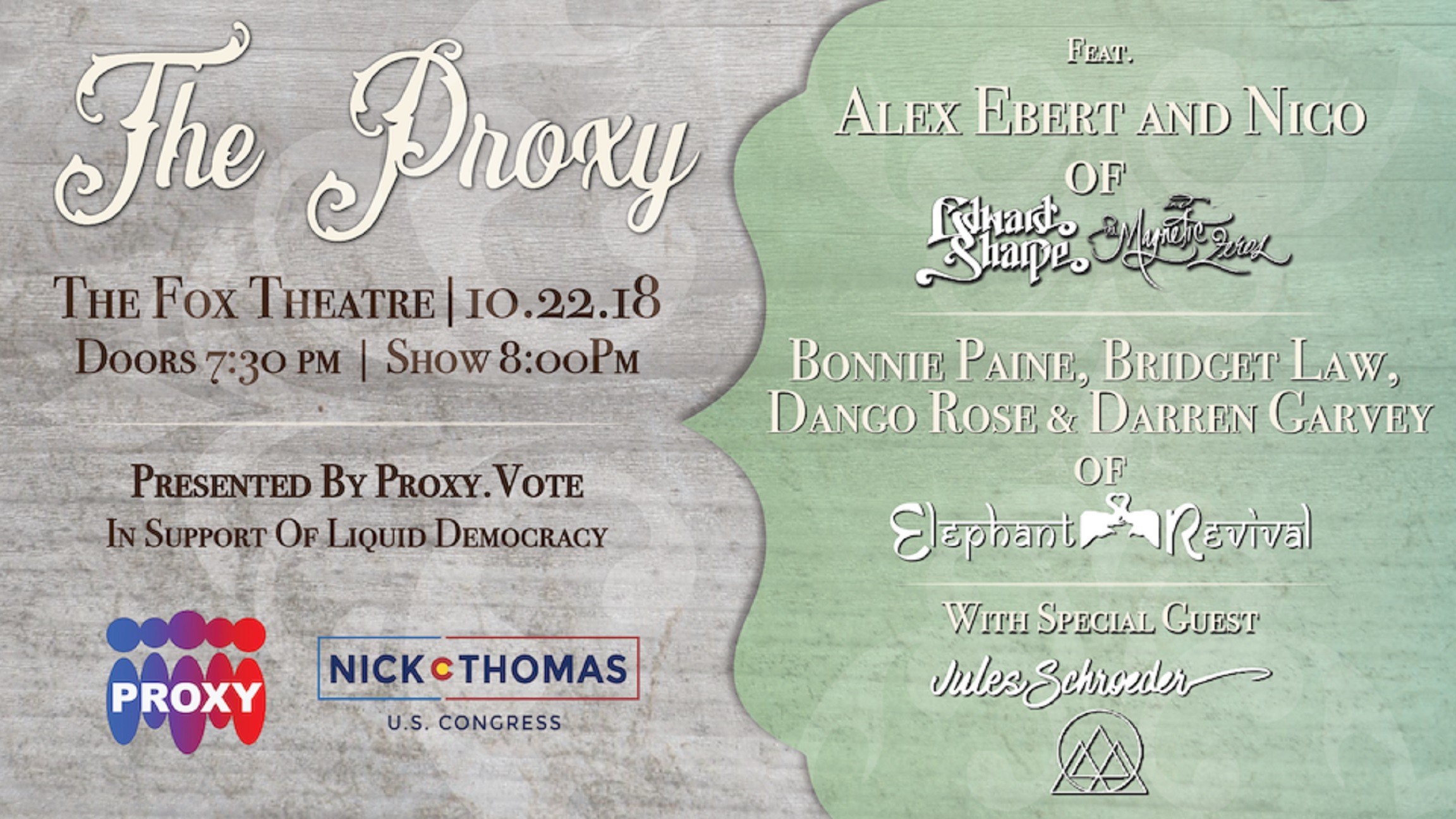 The Proxy is a collaboration between members of Edward Sharpe and the Magnetic Zeros (Alex Ebert, Nico Aglietti) and Elephant Revival (Bonnie Paine, Bridget Law, Dango Rose, Darren Garvey) to support Proxy.Vote–A new, more democratic way to express the will of the people, powered by social and legislative technology that enables voters to organize and… Continue reading The Proxy to play The Fox Theatre October 22nd