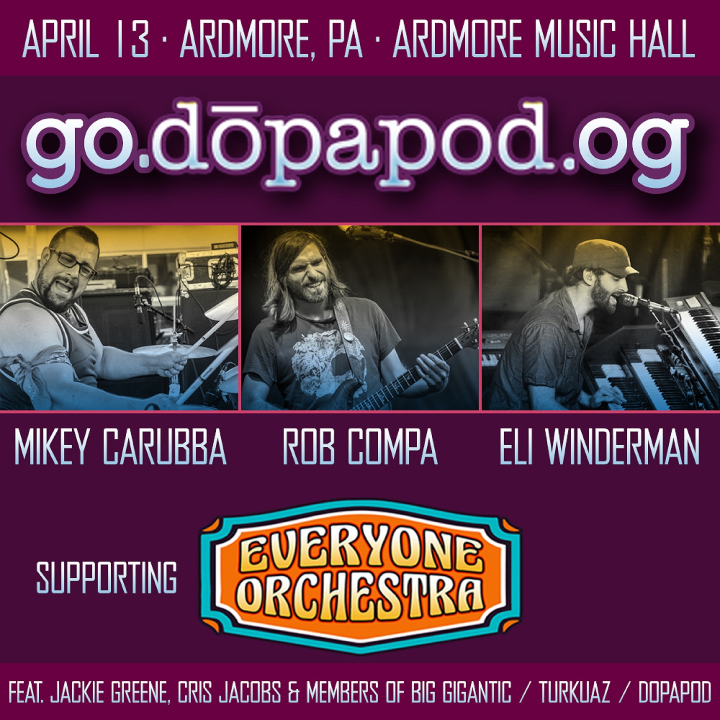 The Ardmore Music Hall welcomes back Matt Butler’s Everyone Orchestra for a night of exciting improvisation from some of the top names in live music plus a special opening set from Go Dopapod OG on Friday, April 13. Everyone Orchestra will feature guitarists Jackie Greene and Cris Jacobs, drummer Jeremy Salken of Big Gigantic, bassist… Continue reading Everyone Orchestra + Dopapod Trio @ Ardmore Music Hall