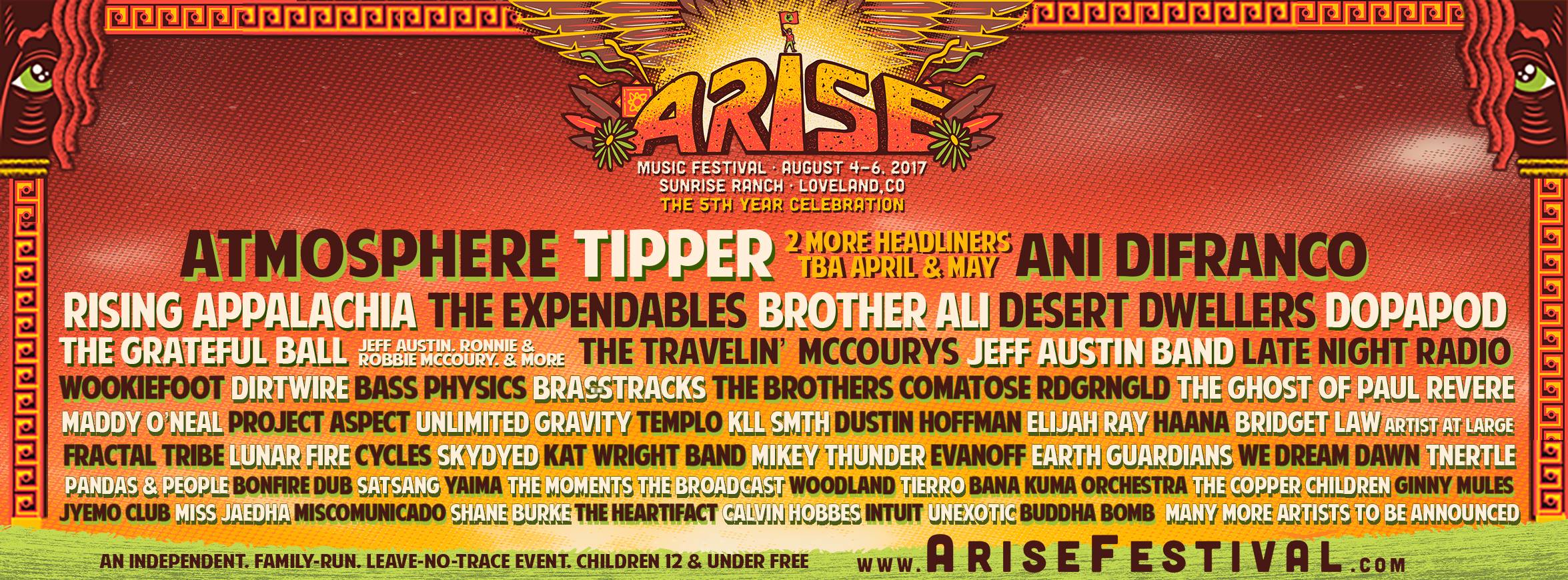 Mark your calendars for ARISE Music Festival’s 5th Year Celebration this August 4-6 at Sunrise Ranch in Loveland, Colorado. The 2017 ARISE Festival lineup includes Atmosphere, Tipper, Ani DiFranco, Rising Appalachia, Brother Ali, The Expendables, Dirtwire, Desert Dwellers and Late Night Radio; as well as featured appearances from bluegrass favorites The Travelin’ McCourys, Jeff Austin… Continue reading ARISE Festival Announces 2017 Lineup