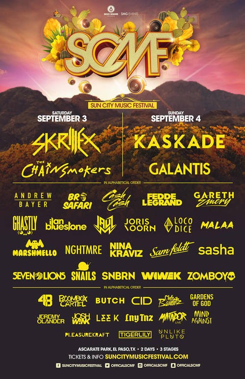 We’re excited to reunite with our tribe of desert dwellers this Labor Day weekend at Sun City Music Festival in El Paso, Texas! Countdown the summer season with us on the winding Road to SCMF, September 3-4th, at Ascarate Park where we’ll enjoy closing sets from headliners Skrillex, Kaskade, The Chainsmokers, and Galantis each night… Continue reading Sun City Music Festival Announces Lineup