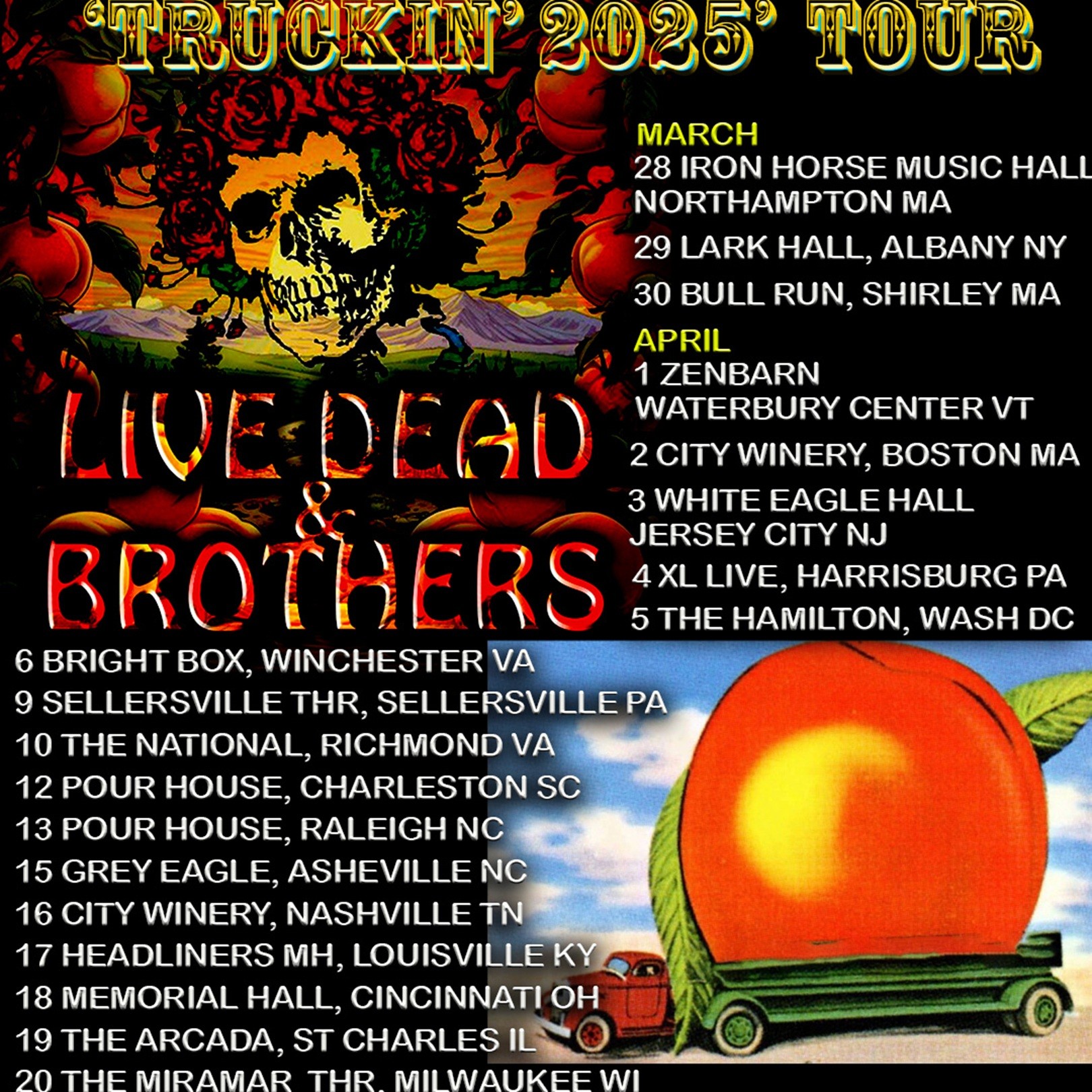 LIVE DEAD & BROTHERS are thrilled to announce their highly anticipated “Truckin’ 2025” Tour, celebrating the enduring legacy of the Grateful Dead and The Allman Brothers Band. Featuring a powerhouse lineup—Berry Duane Oakley, Steve Kimock, Mark Karan, Scott Guberman, and Pete Lavezzoli—the group will bring their soul-stirring, improvisational jam sessions to audiences across the East… Continue reading From the Allman Brothers to the Grateful Dead: Live Dead & Brothers Hit the Road with ‘Truckin’ 2025’