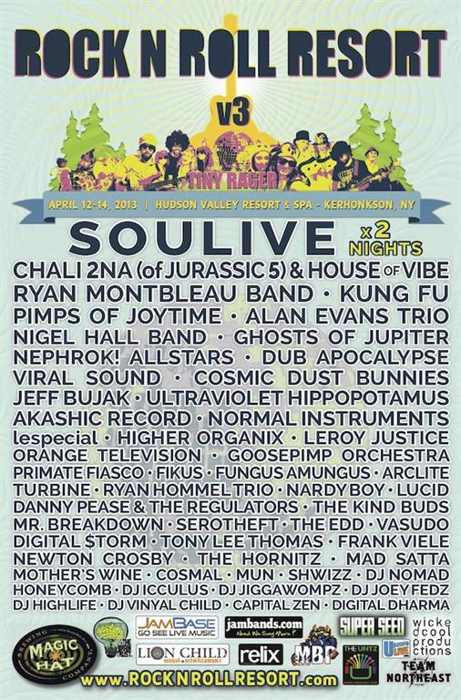 Wicked Cool Productions announces their complete lineup, adding Jurassic 5 founding member and the Grammy Award winning Ozomatli member, Chali 2na to its newest event, Rock n Roll Resort v3: Tiny Rager, taking place April 12-14, 2013, at the Hudson Valley Resort & Spa in Kerhonkson, New York.Chali 2na will join headliners Soulive as well… Continue reading Rock n Roll Resort Announces Complete 2013 Lineup