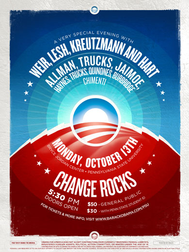 The Pennsylvania Campaign for Change has just announced a Monday, October 13 concert fundraiser to benefit Obama for America featuring many Rock and Roll Hall of Fame inductees and other American music icons. Additionally, the show will be a very large voter outreach opportunity for the Pennsylvania Obama campaign, which has already built the largest… Continue reading Change Rocks at Pennsylvania State University