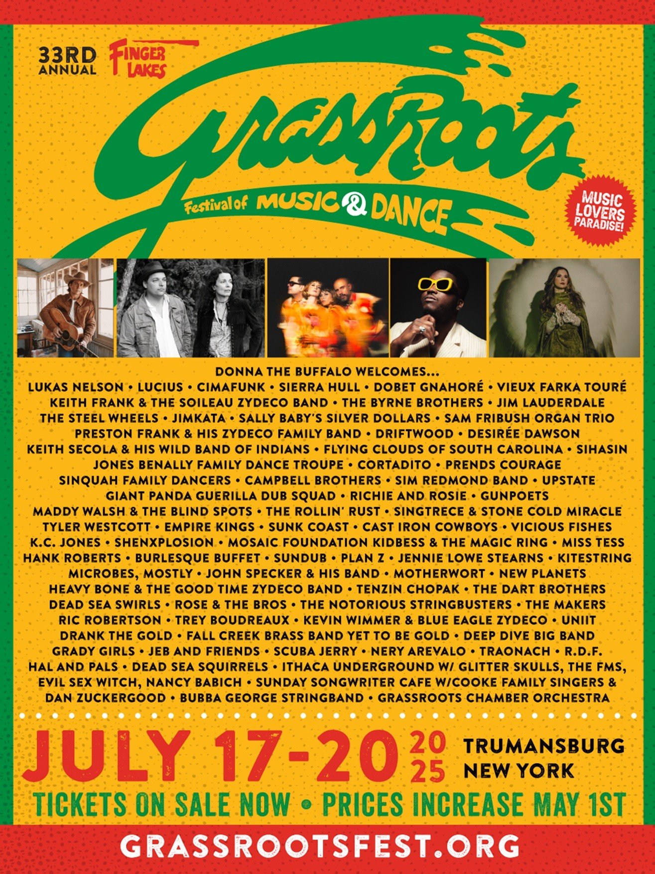 The 33rd Annual Finger Lakes GrassRoots Festival of Music & Dance is set to transform the Trumansburg Fairgrounds into a four-day celebration of art, community, and global sound next weekend, July 17–20, 2025. Hosted once again by Americana mainstays Donna the Buffalo, the genre-spanning gathering welcomes more than 90 acts across four stages, with newly… Continue reading Finger Lakes GrassRoots Festival Returns July 17–20, 2025, with Lukas Nelson, Lucius, Cimafunk, Sierra Hull, Dobet Gnahoré, Vieux Farka Touré, Donna the Buffalo and Scores More