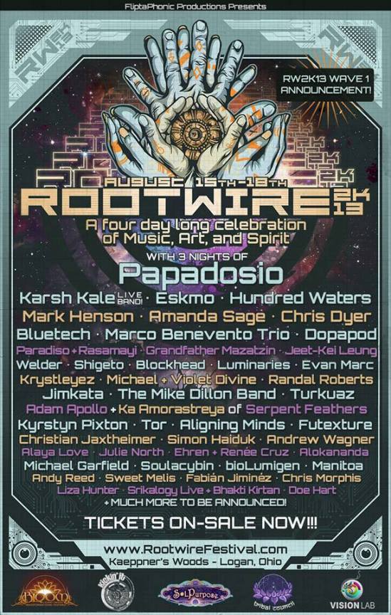 “After months of research, planning, phone calls, emails, and meetings we couldn’t be more excited to bring you what we feel like will be the most eclectic and forward thinking artist lineup of Summer 2013, and this is only the first wave! As with every year, we have meticulously searched far and wide for the most amazing and inspiring musicians, artists, and presenters out there and are assembling them for your experiential and mind-glowing pleasure at the fourth annual Rootwire!
