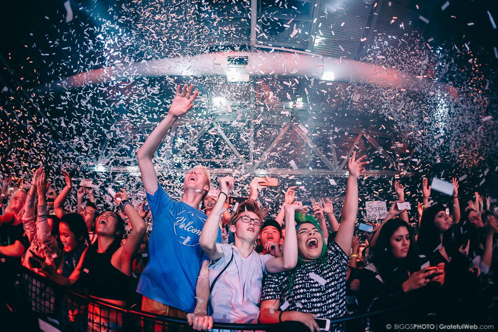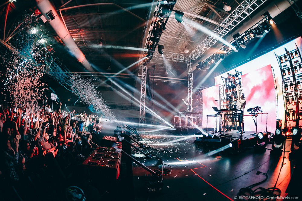 This stop on the Shelter Live Tour took place at the conference center at the McClellan Air Force Base. The McClellan Conference Center is a very versatile space, as it is essentially a large, open warehouse. For the Shelter Live Tour, this space included a single stage, set in the very back of the warehouse. Though the venue proved to be a bit uninteresting, the production made up for the venue tenfold. Streamers, spotlights, and smoke were all synchronized to a flawless set bursting at the seams with all of Madeon’s and Porter Robinson’s hits.