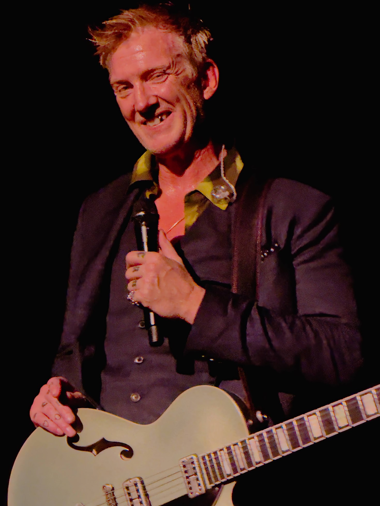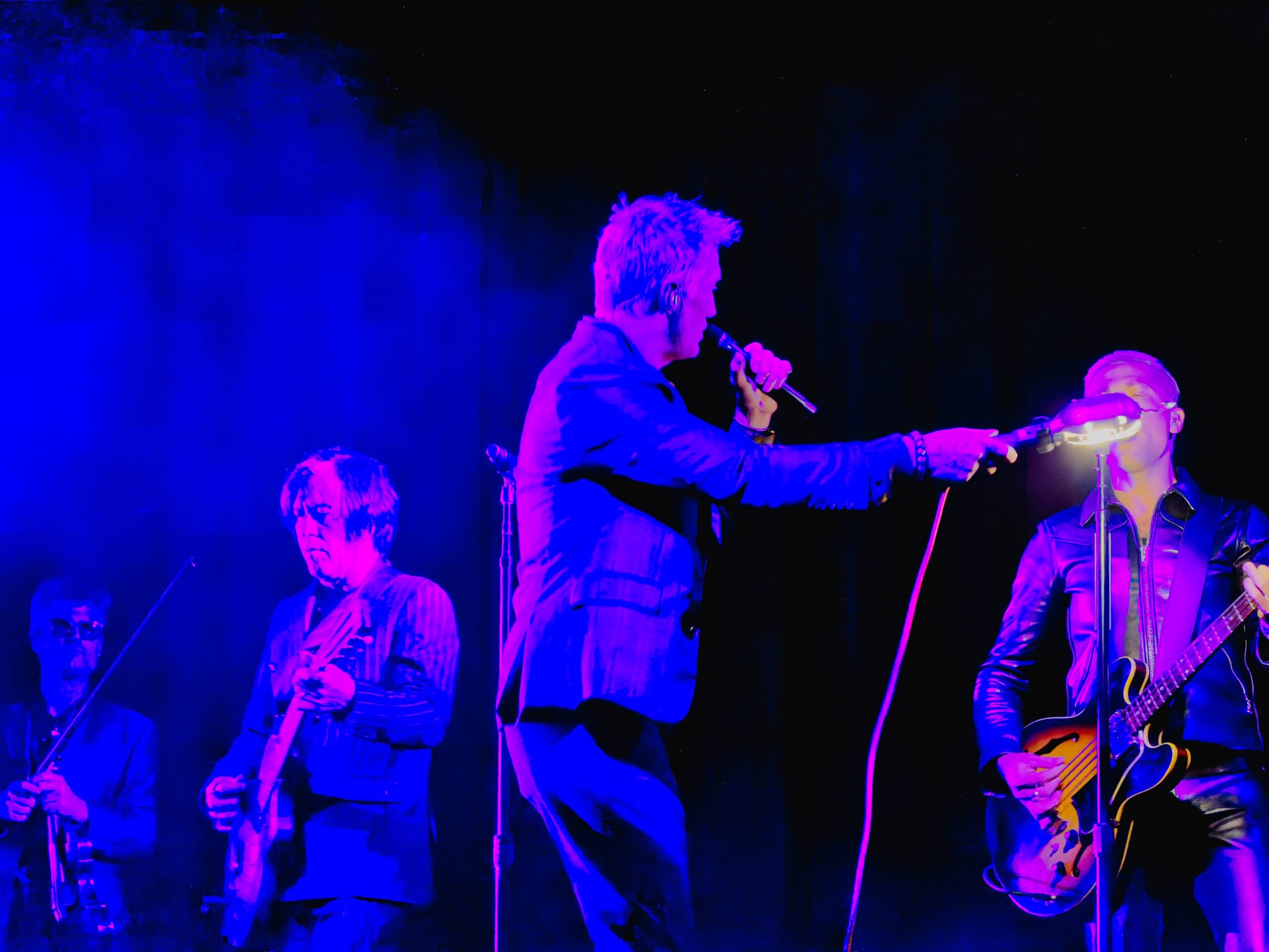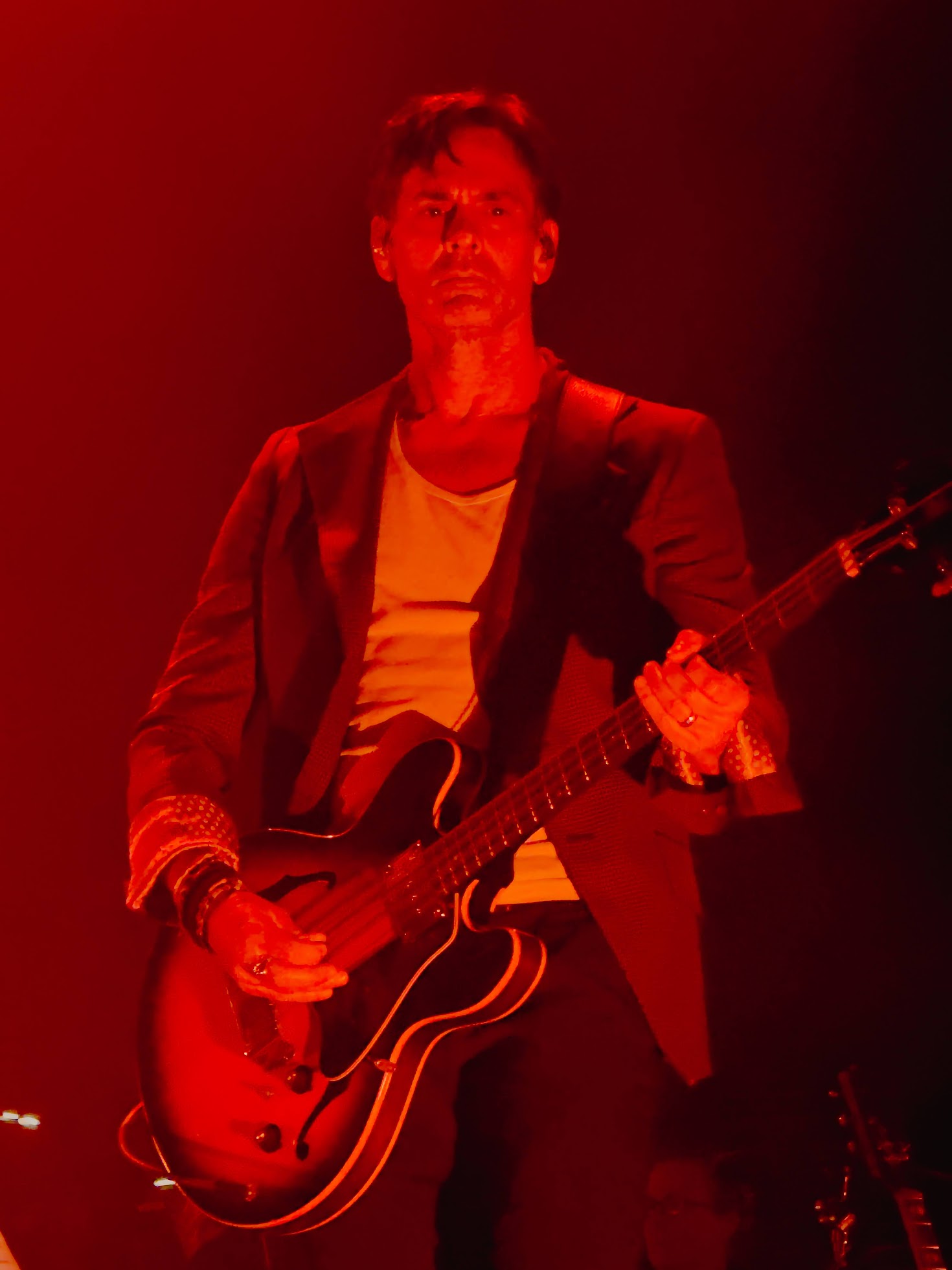 As the lights dimmed, the audience was transported into a dark-horse cabaret atmosphere as Homme introduced the evening, drifting down the aisle and easing into a medley of “Running Joke” and “Paper Machete.” His performance oozed an ominous charm reminiscent of characters from the Weimar Republic or Sondheim’s Sweeney Todd, even brandishing a menacing meat cleaver as a prop—further enhancing his persona as the demon troubadour of State Street.