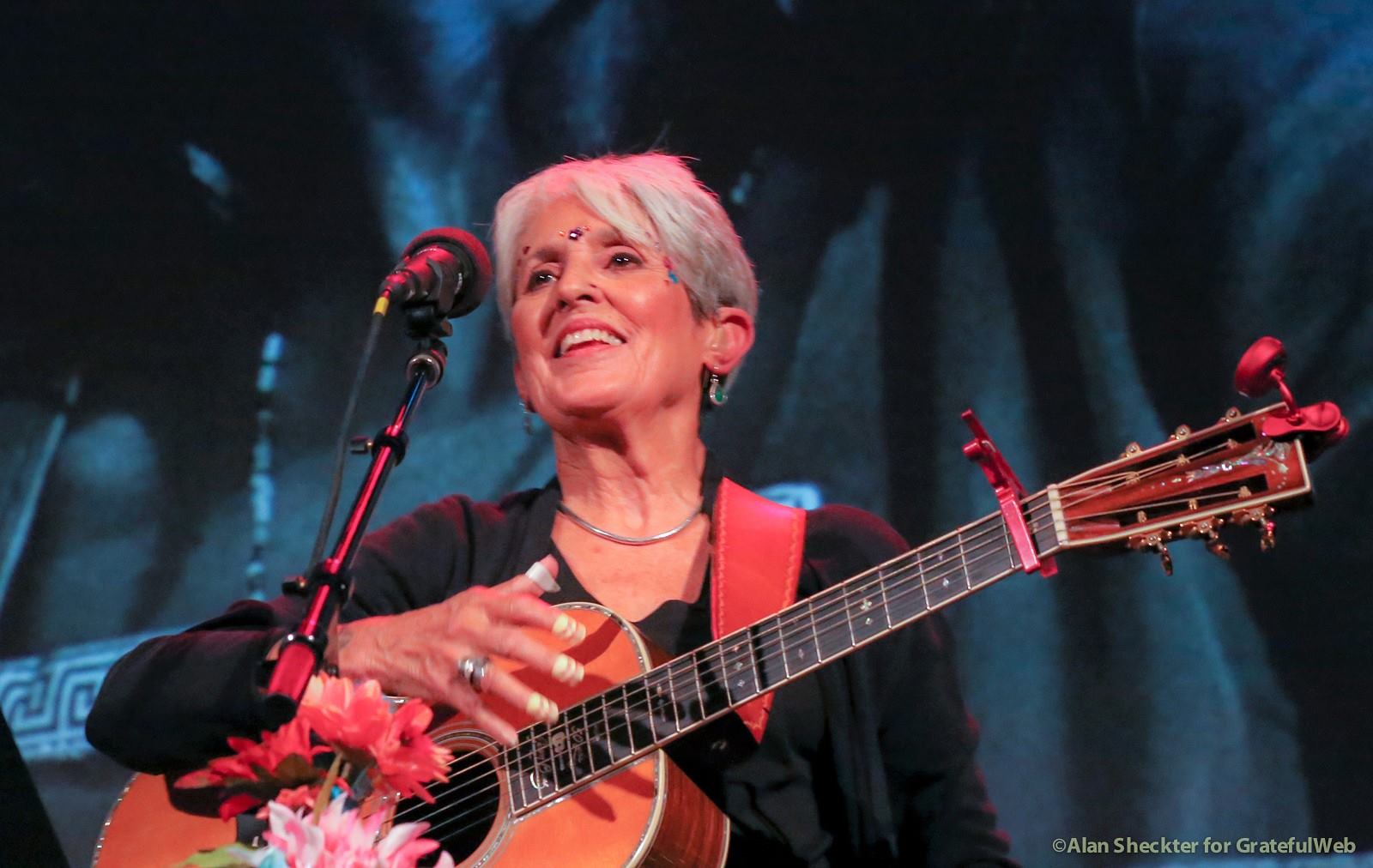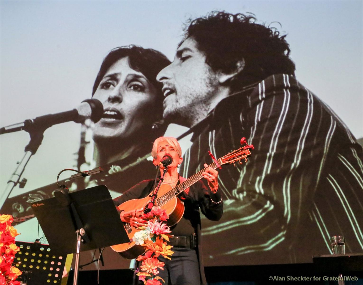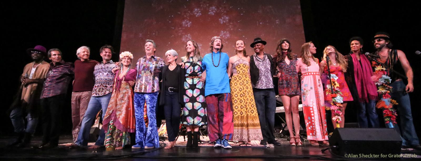 Making a nice segue, Liberatore said that while The Grateful Dead toured with Bob Dylan in 1986 and ’87, there was a performer who collaborated with Dylan far earlier. Applause and cheers increased as the crowd sensed and then watched as the featured performer, Joan Baez took the stage. Now 76 and with a still strong and uniquely distinguishable voice, Baez launched into a captivating medley of Dylan songs. While slides on the big screen showed images with, and without, Dylan through the years, Baez’s solo acoustic set included “Sad-Eyed Lady of the Lowlands,” “I Pity the Poor Immigrant,” “It’s All Over Now, Baby Blue,” “Blowin’ in the Wind,” and “Don’t Think Twice, It’s All Right.”