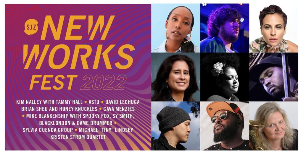 Immediately following the SJZ New Works Fest 2022, San Jose Jazz will stream (via Facebook & YouTube) a two-hour concert special with highlights from each week of the Fest. On May 13, 20-minute live performance excerpts will feature Brian Sheu and Huney Knuckles, ASTU, and Michael “Tiny” Lindsey. On May 14, the stream will include 20-minute excerpts from Mike Blankenship with Spooky Fox, Sy Smith, BLACKLONDON and Dame Drummer; Kim Nalley with Tammy Hall; and Sylvia Cuenca Group. On May 15, the stream will include 20-minute excerpts from Kristen Strom Quartet, Cava Menzies and David Lechuga.