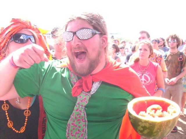 The last day of 10KLF 2009 started with a long slow wait, as thousands of people ignored afternoon acts to down in front at the main stage for Umphrey’s McGee and Dave Matthews Band. Huge swaths of the lawn were fenced off even more elaborately than before to reserve a somewhat unbelievable variety of special passes. Bands were hustling to get their last-minute interviews in backstage, where National Fingerstyle Guitar Champion Tim Clark was playing luxurious and intricate acoustic guitar for the lunching VIPs. The Art Barn had finally flourished into a full-bore live creative orgy, spin art and topless body-painting and a line of locals at the nearby ATM to (hopefully) scoop up some of the frighteningly inexpensive artwork. One vendor had a rock climbing wall set up with a fifty-dollar prize for scaling the hardest face.