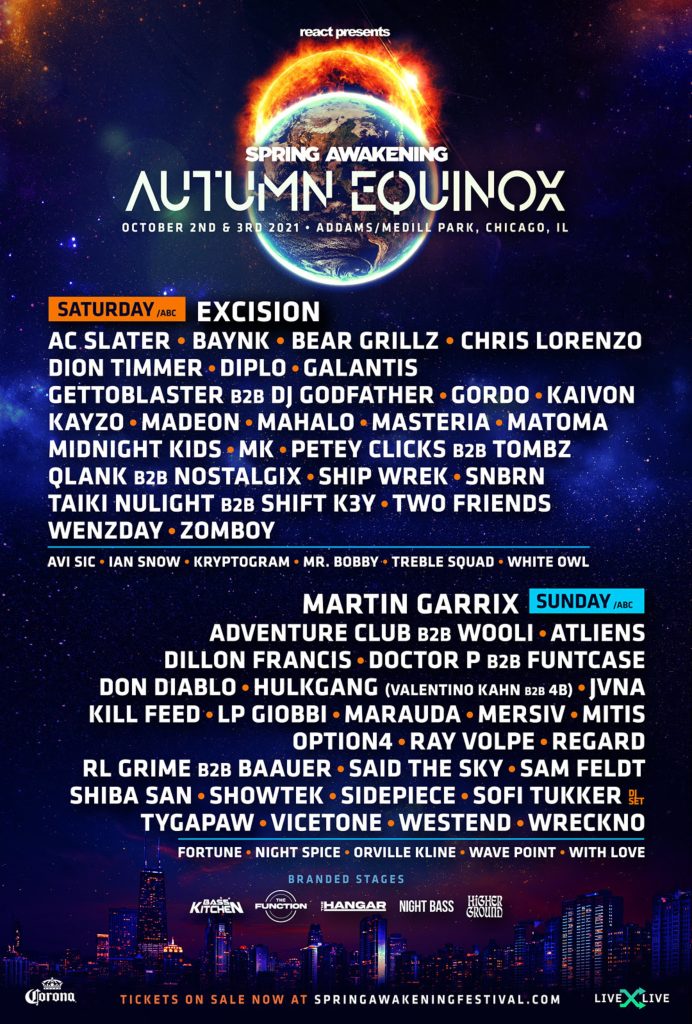 React Presents, revealed today the daily lineup for the AUTUMN EQUINOX addition of its SPRING AWAKENING MUSIC FESTIVAL (“SAMF”) taking place at Addams/Medill Park in Chicago, IL on October 2-3, 2021. Features over 60 artists across the electronic music spectrum, including Excision, Galantis, and Diplo on Saturday, along with Martin Garrix, RL Grime b2b Baauer, and Dillon Francis on Sunday.