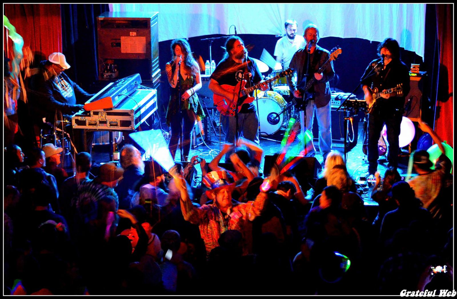 They started off the night with Shakedown Street, as if to say, “Welcome to our party,” and played it long and bluesy, while balloons (strange ones) were passed out by pranksters, inflated, and left to bounce atop the crowd (and occasionally across Melvin’s keys). Vocalist Kara Cavanaugh sang a slow, soulful number after that, leading into an uplifting Friend of the Devil with Mark Karan on vocals. The first set bounced back and forth between upbeat and serene; Promised Land had Melvin practically screaming on the keys, followed by a slow and steady It Must Have Been The Roses sung by Terrapin Flyer founder Doug Hagman, then back to electrified with the Rufus Thomas classic Walkin’ the Dog. The set closed out with Jerry Garcia Band’s That’s What Love Will Make You Do, after which the band intoned, “Get your mind adjusted a little bit more towards this room, and we’ll do the same thing.”
