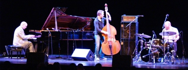 After the intermission, the lights flickered the theatre style warning, and the threesome took the silent stage. Modestly, the trio weaved “Let Our Garden Grow,” into the silence. The extremely improvisational and sporadic drummer David King stood out immediately. This was the start of quite possibly one of the best percussion performances by one man that I have ever seen. Although all members of this band are talented beyond belief, I found it hard to take my attention away from King. This was also echoed by a friend and song writer, Garrett Hogan after the show. The next piece was the gigantic “Big Eater,” that capsulated changing time signatures and a great stand up bass solo by the song’s author, Reid Anderson. Pianist and commentator for the band Ethan Iverson nicknamed the song “Big Polyrhythm” for those who are in the know. David King’s “Anthem for the Earnest,” was next with more mind blowing, rise and fall, rapid fire drum work. Iverson came to microphone again to ask the ever important question, “Is there life on Mars?” Then he answered it by confirming for the crowd that there was, while starting the David Bowie standard, “Life on Mars.” The next piece was prefaced by the lighter comedic side of the band. Iverson told a great detailed story about a trip to a thrift store. He asked, “Are there any fans of the band Saga?” The house was quiet, then there was laughter. Iverson continued, “This song is about a man who walks into a thrift store and finds a great old shirt of his favorite band Saga. The only problem was that the shirt is way too small. He was very disappointed and despondent while leaving the store. Just as he was approaching the exit, there was a lockdown case with watches and other things in it. In that case, the man finds something perfect and special, and he ends up leaving the store happy after all. This is “Thrift Store Jewelry,” written by David King. King’s drums continued to wow the crowd further. The next story was about a shy and secretive girl who doesn’t know much about her past. Barrel is her name, and one of the things that she loves to do when she’s alone is dance. This is another Reid Anderson song, which was played especially well by Ethan Iverson on this night. That’s the beauty of this band. They are very tight and diverse.