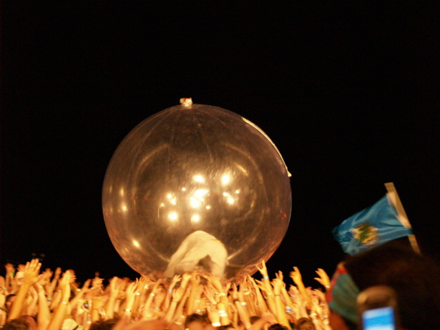 This was an amazing experience for me! It started with talking to Wayne Coyne, the pepper haired guitar player and front man of the band earlier in the day at the press conference and ended with streamers, sing-a-longs, and a colorful array of music. “Isn’t this fun? Isn’t this the most perfect night of the festival?” Wayne shouted out to the crowd. It was a much more perfect night now. I gave this show my third star of the weekend because of their elaborateness. The intelligence and keen sense of knowing radiates from Wayne Coyne like a twinkling star in the sky. There is something about him that is special. He is honest, plain speaking, and friendly. As a matter of fact, when discussing the future of these special music festivals that seem to be infiltrating the country, Coyne warns that they must keep changing for their success to continue. He talked about a festival that they attended in 1987 with bands like Sonic Youth and Europe, known for, as he sang aloud, “The Final Countdown.” He said, “The reason why festivals like that and Lollapalooza are unsuccessful are because they stayed within the same genre. Festival creators have to keep it new or else their following will say that they’ve already been there and done that.” He continued to praise the way that festivals like Bonnaroo and Wakarusa mix up the type of bands that play at their festivals. Coyne also mentioned that they work because they are, “intense experiences for youths. There’s sex, drugs, and rock n’ roll. What’s better than that?” However he was clear to say that festivals do not change the world. He said that it may change people, but they did not feed starving people or save the lives of the oppressed. These are messages that were also relayed during an amazing on stage performance. Although the show started a little late due to technological problems, it did start off with a bang from the streamer spewing gun that Wayne Coyne shot off to mark the beginning of the show. As he got into the gigantic blow-up ball, I helped him get off the stage and passed him back into the crowd. It was fun to be in the press section for this show. As he sailed through the front of the crowd and back on the stage the music continued and off we went into another dimension or at least it felt like it. For their second song, they did a crowd sing-a-long of Queen’s “Bohemian Rhapsody.” Then, he welcomed a whole stage full of Santa Clauses and Aliens, which he later explained could be interpreted as symbols of the wars between fundamentalists like the Scientologists and the Christians. Like I said earlier, this was quite an experience. I have always read reviews or saw clips of the bigness of a Lips show, but it is a whole different experience to view it first hand. Ironically, they played a lot of songs off of the wonderful album, Yoshimi Battles the Pink Robots. The album seems to be about a metaphorical fight against pink robots, which ends in death and regret. Songs like, “Yoshimi Battles the Pink Robots Pt.1,” “One More Robot/Sympathy 3000-21,” and “Do You Realize,” were extra meaningful and intense with a stage full of Santa Clauses and Aliens. As I imagined it would be, the show was aesthetic. They brought me to a beautiful place. The only small problem that I had was that they took a little too long between songs. It was a performance show, which made it entertaining. The screen was gigantic and Wayne’s face, specifically his nostrils were close up to crowd to provide a trippy ride through the night. “She Don’t Use Jelly” and “The Yeah, Yeah, Yeah Song” were another two of the night’s sing-a-long rides through the carnival. Overall, I thoroughly enjoyed myself at the show. The only question that I have is, do they do these tricks at every show? From what I know of they do, and I still can’t wait to see them with Ween at Red Rocks in July