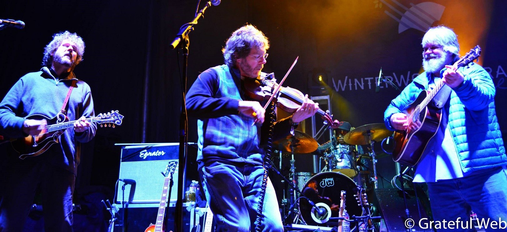 As the sun went down, free beer three hour was over, probably for the best, as there was much more great music ahead to be coherent for. Next came out Greensky Bluergrass. The Kalamazoo, Michigan based Jamgrass act has earned sincere clout in the Colorado bluegrass community. Now regulars at Telluride Bluegrass, and pretty consistently selling out Denver, Boulder, and Fort Collins area theatres, its apparent that the guys are at the height of their popularity and creativity. In particular dobro-man Anders Beck has been a particularly sought after session jam musician, but really all of the guys are super impressive. They combine a real folk/Americana sensibility while managing to build climactic jam-gasams that allow their crowd to get carried away with them. No doubt these guys have earned the respect of their newgrass elders. Newgrass creator and legend Sam Bush came out with Leftover Salmon‘s fantastic Drew Emmitt to play with Greensky at the end of their WinterWonderGrass appearance.
